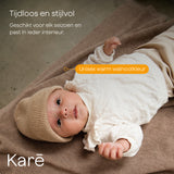 De natuurlijke eigenschappen van merinowol zorgen ervoor dat je kleintje het nooit te warm of te koud heeft. De warme walnootkleur past prachtig in elk interieur en de lichte, ademende structuur maakt deze deken perfect voor gebruik in elk seizoen. Een tijdloos stuk dat met jullie meegaat naar alle bijzondere momenten samen.