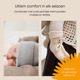 Merinowol is echt een wonder van de natuur! Het is hypoallergeen, natuurlijk ademend en heeft een unieke eigenschap: het regelt automatisch de temperatuur. Te warm? De wol laat warmte ontsnappen. Te koud? Het houdt warmte vast. Zo heeft je kleintje het altijd perfect op temperatuur.