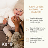 Merinowol is hypoallergeen en ademend, perfect voor gevoelige babyhuidjes. De neutrale, romige tint past prachtig bij alle eerste outfitjes. En met de meegeleverde dustbag van 100% gerecycled katoen berg je ze na elk gebruik stijlvol op. Want de eerste stapjes verdienen iets bijzonders!