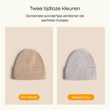 De set bestaat uit twee beanies in de kleuren Bon Beige en Mixed Grey, perfect voor jullie eerste maanden samen. En met het oog op de tijd dat je kleintje groot is, maken we de mutsjes zonder restafval en gebruiken we 100% biologisch afbreekbare verpakking.